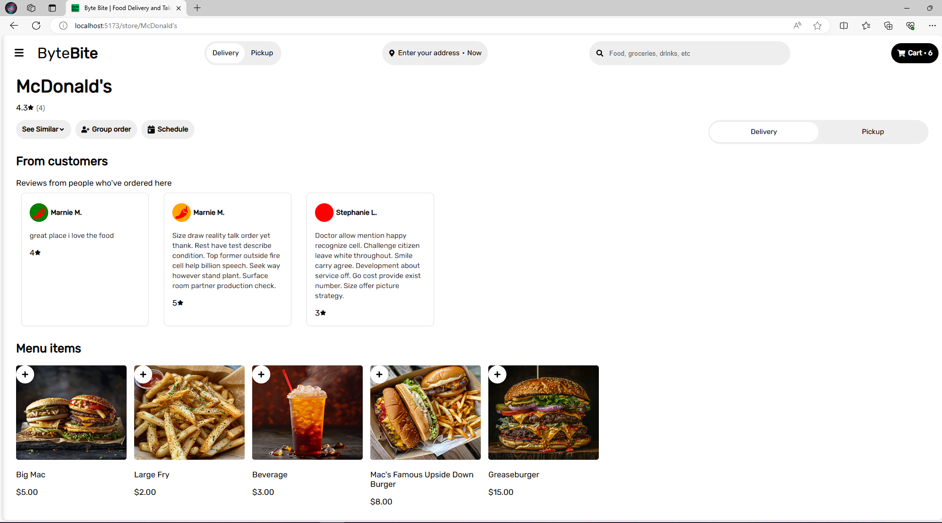 Bytebite was group project to clone Ubereats. I designed the main page, restaurant page, shopping cart, and order confirmation page, as well as filled in wherever needed for bugfixing during deployment.