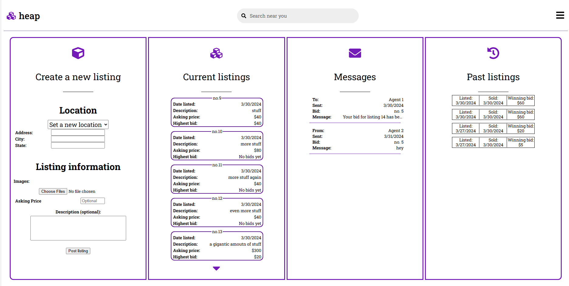 Heap is an online marketplace aimed at providing industry specific tweaks for metal traders and processors. First conceived of as a mobile project, it was adjusted to fit the demands of a web-based capstone and offers most of its functionality through widgets on the main page.