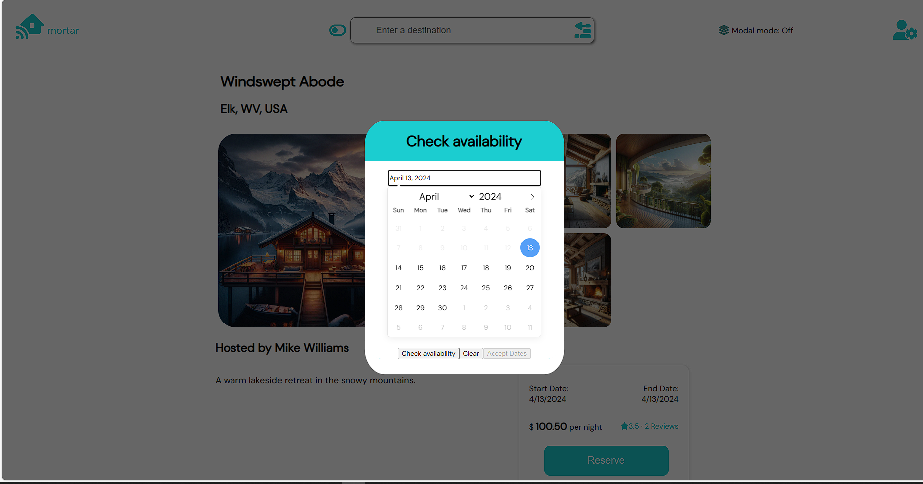 Mortar is a clone of airbnb and my first fullstack development project. Simply put, it books stays at user-created spots, correctly handling errors with booking conflicts and implementing the Flatpickr dependency to disallow selection of booked dates.